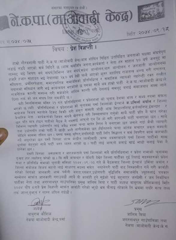 पर्सामा माओवादीको असन्तुष्ट पक्षले आज पत्रकार सम्मेलन गरेर पार्टी केन्द्रीय सचिवालय सदस्य उर्मिला अर्याल जिल्ला अध्यक्ष बिजय महतोलाई कारवाही गरेको घोषणा गरेको छ ।