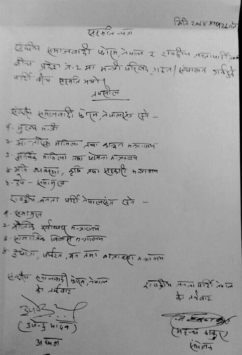 प्रदेश नं २ को सरकार निर्माणकालागि संघीय समाजवादी फोरम र राजपाबीच सहमती भएको छ ।