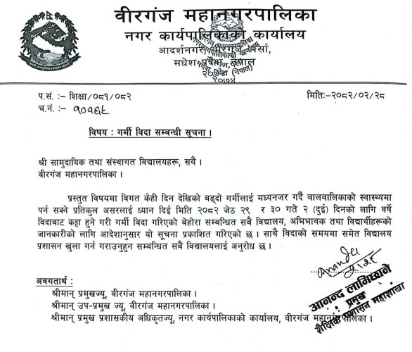 वीरगन्ज । वीरगंज महानगरपालिकाले बिद्यालयको छुट्टी बढाएको छ । यस अघि महानगरपालिका शिक्षा शाखाले असार १ गते आइतबारदेखि बिद्यालय संचालन हुने गरि बिदा दिएको थियो ।