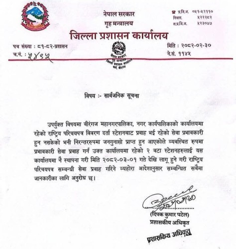 वीरगञ्ज । राष्ट्रिय परिचयपत्र बनाउने वीरगंज महानगरको स्टेशन बन्द भएको छ । जिल्ला प्रशासन कार्यालय पर्साले एक सूचना सार्वजनीक गर्दै परिचय पत्र बनाउने महानगरबाट हटाएको जनाएको छ ।