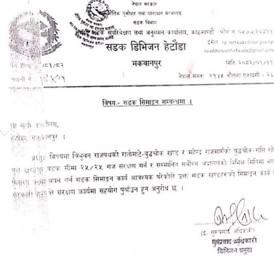 वीरगंज ।सडक डिभिजन कार्यालय हेटौडाले नापी कार्यालय हेटौडालाई सडकको सीमाङ्कन गरिदिनकालागि पत्र लेखेको छ ।त्रिभूवन राजपथको रातमाटे देखी बुद्धचोक र महेन्द्रराज पथको बुद्धचोक देखी राप्तीपुल सम्मको सडकको सीमा नाप जाँच गर्नकालागि कार्यालयले बैशाख ११ गते नै पत्राचार गरेको हो ।