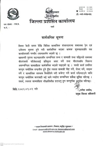वीरगंज । सामाजिक संजाल मार्फत उत्तेजाना । अराजकता फैलाउने किसिमका पोष्ट गर्नेहरुलाई स्थानीय प्रशासनले कारावाहीको चेतावनी दिएको छ ।
