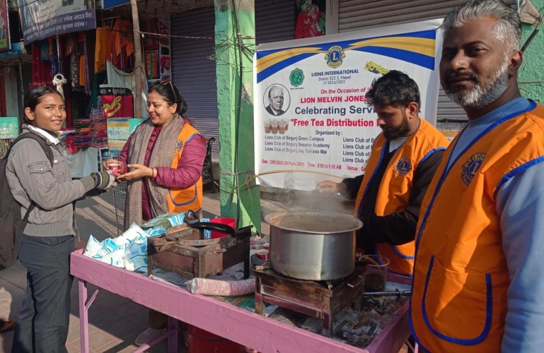 वीरगञ्ज । अन्तर्राष्ट्रिय सामाजिक संस्था लायन्स क्लब ईन्टरनेशनलका संस्थापक मेल्भिन जोन्सको १४६ औं जन्म दिवसको अवसरमा वीरगञ्जको माइस्थान क्षेत्रमा करिब पाँच सय जनालाई चिया वितरण गरिएको छ ।