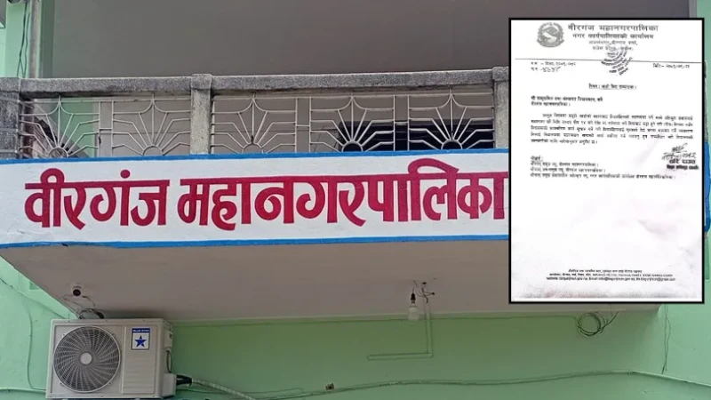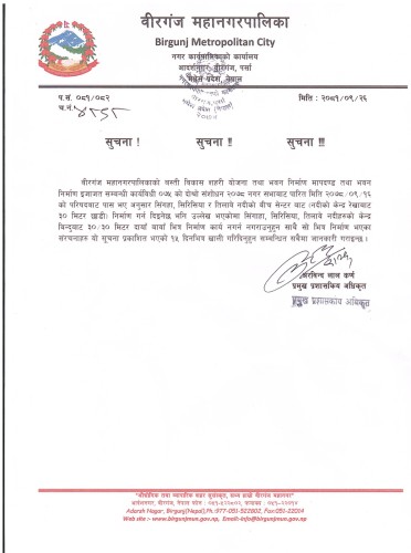 वीरगंज । वीरगंज महानगरपालिकाले नदी किनार अतिक्रमण गरी निर्माण गरिएका संरचना खाली गर्न सूचना जारी गरेको छ ।