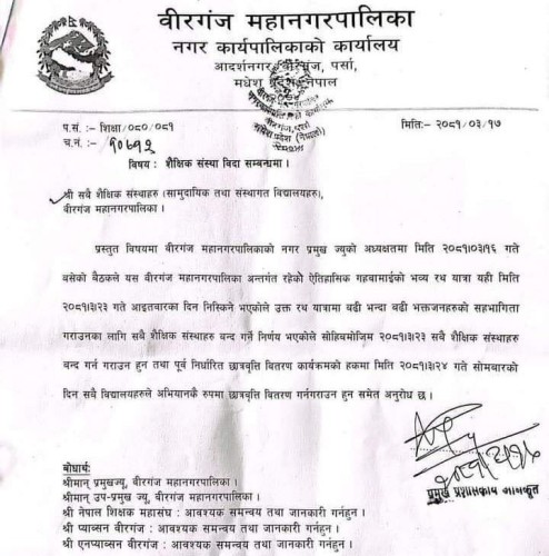 वीरगञ्ज । गहवामाईको रथयात्राका दिन वीरगञ्जको सम्पूर्ण विद्यालयमा पठनपाठन बन्द रहने भएको छ । बीरगंज महानगरपालिकाले एक सूचना जारी गर्दै बिदालय बन्द रहने जनाएको हो ।