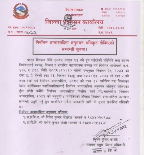 वीरगंज । प्रतिनिधिसभा सदस्य निर्वाचनलाई शान्त, निष्पक्ष र विश्वसनीय वातावरणमा सम्पन्न गराउन पर्सा जिल्लामा निर्वाचन आचारसंहिता अनुगमनका लागि अधिकृतहरू खटाइएको छ।