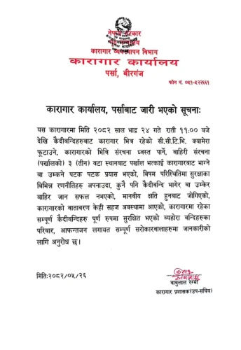 वीरगञ्ज । वीरगको कारागार प्रशासनले एक बिज्ञप्ति जारी गरि कारागारका कैदी बन्दी सबै सुरक्षीत रहेको जनाएको छ । कैदी बन्दीहरुले भाग्ने प्रयास गरेको तर भाग्यो योजना सफल नभएको जनाएको छ ।