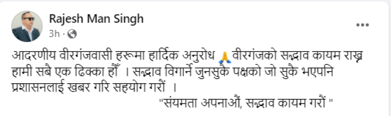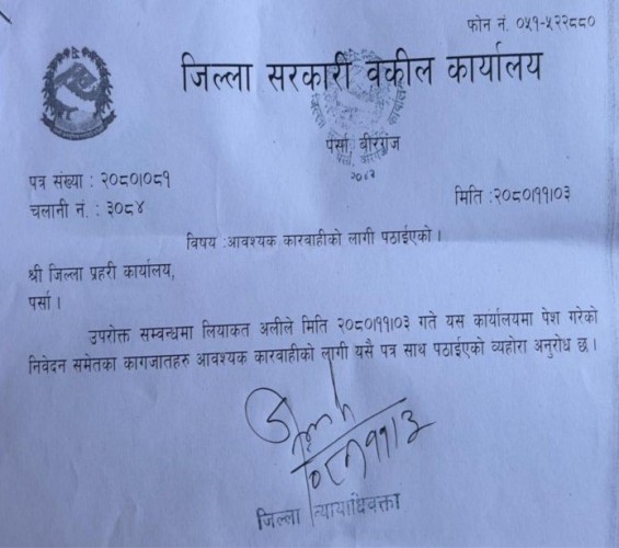 वीरगञ्ज । पर्साका प्रमुख जिल्ला अधिकारी दिनेश सागर भुसालले धार्मिक, सामाजिक, सदभाव बिगार्ने समाग्री कुनै सञ्चार माध्यमबाट प्रशारण नगर्न अनुरोध गरेका छन ।