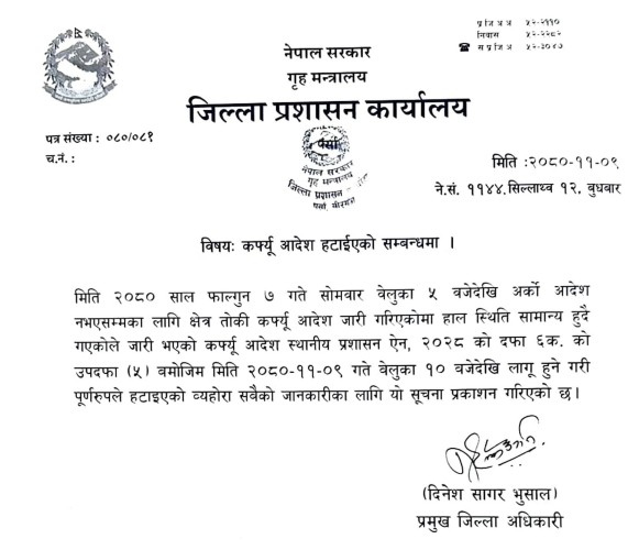 वीरगञ्ज । फाल्गुण ५ गते देखी जारी कर्फ्यू जिल्ला प्रशासन कार्यालय पर्साले हटाएको छ । जिल्ला प्रशासन कार्यालय पर्साले फाल्गुण ९ गते राती १० बजे देखी कर्फ्यू हटाएको जिल्ला प्रशासन पर्साद्वारा जारी सूचनामा उल्लेख छ ।