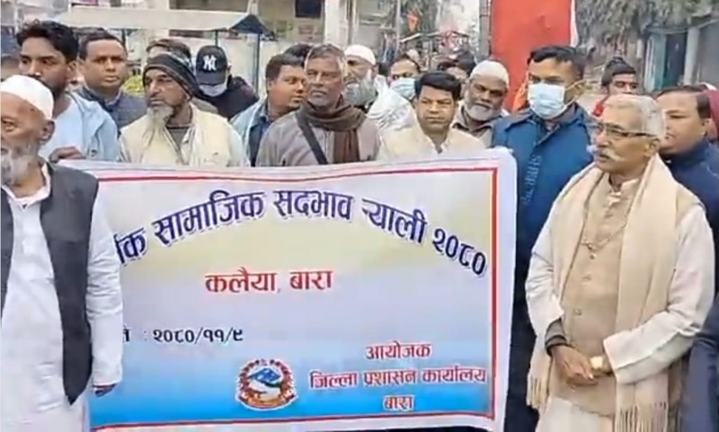 कलैया । बाराको कलैयामा धार्मिक सद्भाव बिग्रन नदिन सद्भाव र्याली निकालिएको छ । जिल्ला प्रशासन कार्यालय बाराको अगुवाइमा धार्मिक संघसंस्थाको सहयोगमा बुधवार विहान सद्भाव र्याली निकालिएको हो ।