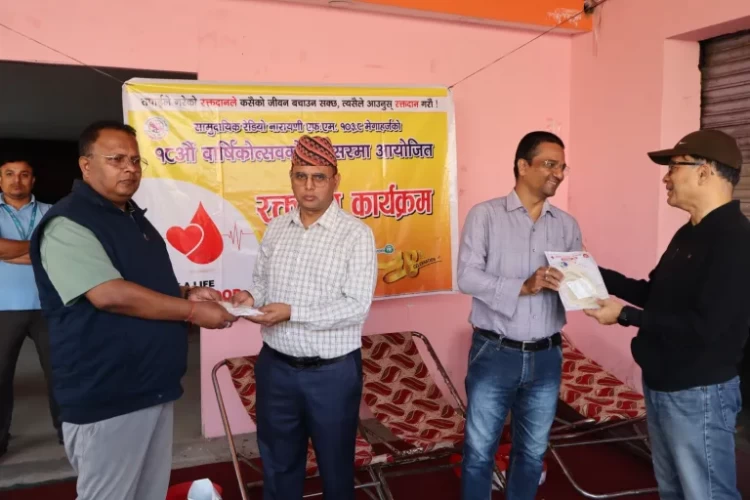 वीरगञ्ज । मधेस प्रदेशको पहिलो समुदायिक रेडियो नारायणी एफएम १०३.८ मेगाहर्ज १८ औं बर्षमा प्रवेशको अवसरमा रक्तदान कार्यक्रमको आयोजना गरिएको छ ।