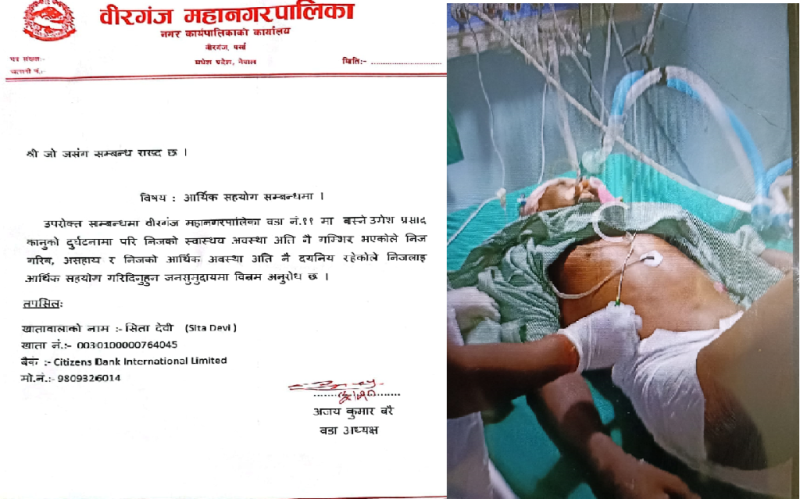 वीरगंज महानगरपालिका वडा नं १४ का उमेश प्रसाद यादवलाई उपचारकालागि सहयोग उपलब्ध गराइदिन सोही वडाका वडाध्यक्ष अजय कुमार बरैले अपिल गरेका छन ।