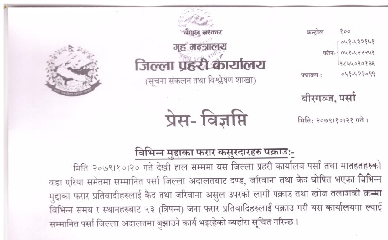 विभिन्न मुद्दाका फरार कसुरदारहरुलाई पक्रिने अभियानलाई जिल्ला प्रहरी कार्यालय र त्यसका मातहत कार्यालयले तिब्रता दिएका छन ।
