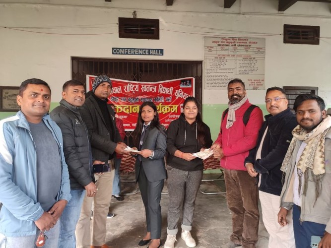 अखिल नेपाल राष्ट्रीय स्वतन्त्र बिद्यार्थी युनियन ठाकुरराम बहुमुखी क्याम्पसको क्याम्पस कमिटी र नेपाल खेलकुद महासंघको वीरगंज महानगर कमिटीको आयोजनामा वीरगंजमा रक्तदान कार्यक्रम सम्पन्न भएको छ ।