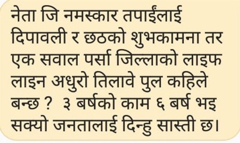 तिलावे पुल निर्माण दबाब समुहले पूल निर्माणको माँग गर्दै देशका प्रधानमंत्री सहितका शिर्ष नेताहरुलाई एसएमएस पठाएको छ ।