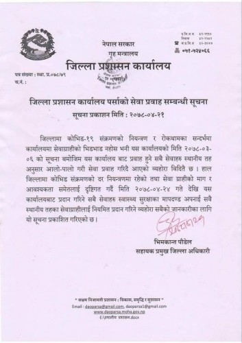 पर्सामा कोरोना संक्रमण दर नियन्त्रणमा आएसँगै जिल्ला प्रशासन कार्यालयले आफ्ना सेवा पूर्णरूपमा सञ्चालन गरेको छ ।