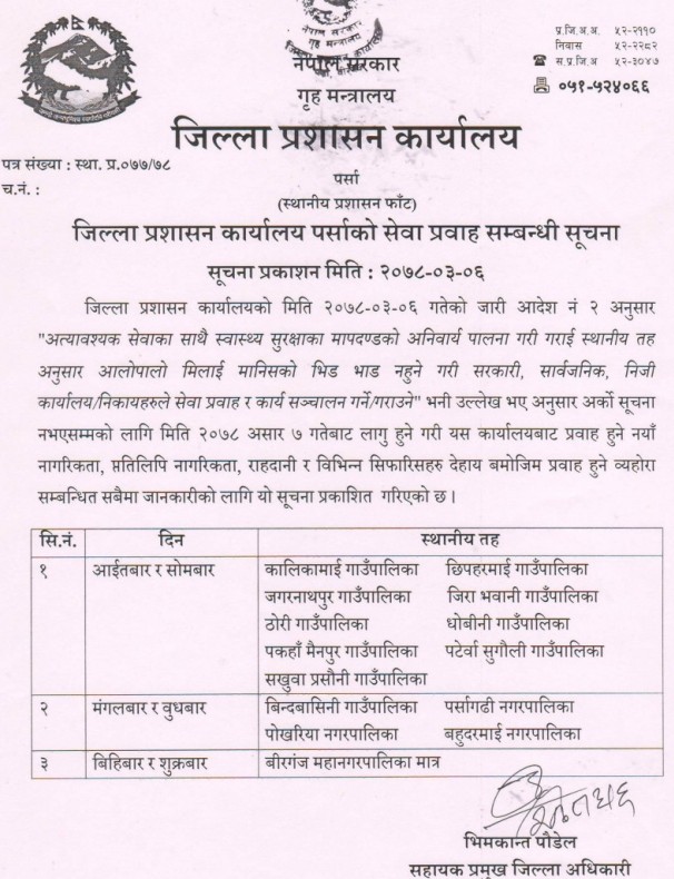 स्थानीय प्रशासनले निषेधाज्ञा खुकुलो पारे संगै सरकार तथा गैर सरकारी कार्यालयहरुले आफनो सेवा संचालनमा ल्याएका छन ।