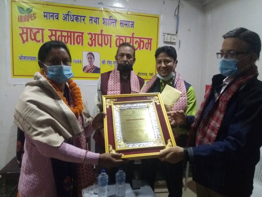 मानवअधिकार तथा शान्ति समाज पर्सा शाखाले आज लक्ष्मी प्रसाद देवकोटाको जयन्तीको अवसरमा श्रष्टा सम्मान कार्यक्रमको आयोजना गरेको छ । वीरगन्जको होटल कन्ट्री इनमा आयोजना गरिएको कामर्यक्रममा साहित्य श्रष्टा रेणु गुप्तालाई सम्मान गरिएको हो ।