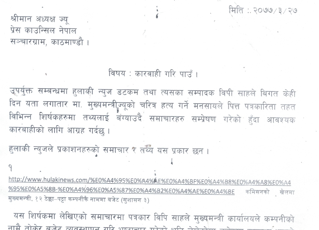 हुलाकी न्युज डटकमले केही दिन यता मुख्यमन्त्री लालबाबु राउतको चरित्र हत्या गर्ने गरि तथ्यलाई तोडमडो गर्दै समाचार संप्रेषण गरेको भन्दै प्रेस काउन्सिलमा अनलाइन उजुरी दर्ता गराइएको छ ।