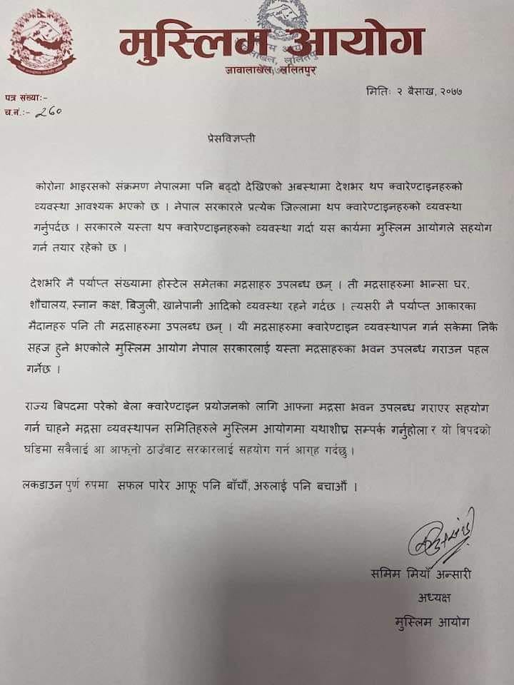 मुस्लिम आयोगले देशमा रहेका मदर्साहरुलाई क्वारेन्टिनका रुपमा उपयोग गर्न प्रस्तव गरेको छ । अयोगका अध्यक्ष समिम अन्सारीले सोमवार एक बिज्ञप्ति जारी गर्दै यस्तो प्रस्ताव गर्नु भएको हो