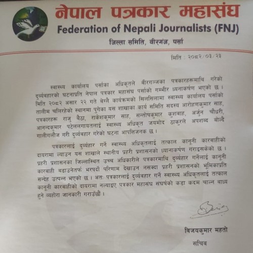 वीरगंज । नेपाल पत्रकार महासंघ पर्सा शाखाले सोमवार एब बिज्ञप्ति जारी गरि स्थानीय प्रशासनको भूमिकाप्रति असन्तोष जनाएको छ ।