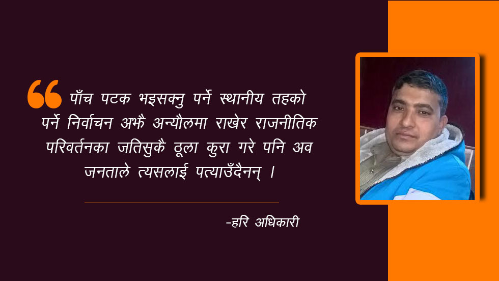 स्थानीय सुशासन र जवाफदेहिता अभिवृद्धिका लागि लोकतन्त्र अनिवार्य सर्त मानिन्छ । नेपालमा बेला बेलामा भएका राजनीतिक परिवर्तनले जनताको विकासको चाहनालाई समेटन सकिराखेको छैन ।